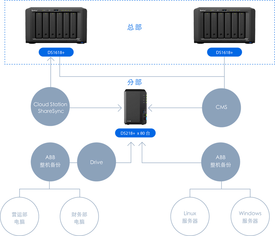 針對(duì)門店?duì)I運(yùn)部、財(cái)務(wù)部電腦里的重要文件,我們?yōu)殡娔X設(shè)置賬戶并進(jìn)行備份。先用 Drive 將辦公文件備份到分部的 NAS 上,然后再通過 Cloud Station ShareSync ?將文件統(tǒng)一同步并歸檔到總部的 DS1618+ 上。想要管理眾多分部的 80 臺(tái) DS218+ 也很方便,我們可以在總部的 DS1618+ 上統(tǒng)一配置、監(jiān)控所有分部的數(shù)據(jù),并選擇性同步下發(fā)各項(xiàng)公文、通知。