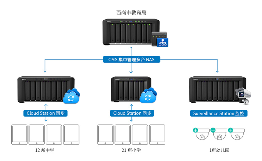 雖然DSM簡(jiǎn)化了單一 NAS 的管理過(guò)程,但是管理多臺(tái) NAS 的工作仍然十分枯燥,一直令西崗區(qū)教育局頭疼的問(wèn)題就包括手動(dòng)更新轄區(qū)內(nèi)所有學(xué)校的服務(wù)器,以及遠(yuǎn)程管理各個(gè)服務(wù)器的狀態(tài),如故障、存儲(chǔ)空間等。為此,群暉提供了高度智能的集中化管理系統(tǒng)(CMS),幫助西崗區(qū)教育局將眾多任務(wù)自動(dòng)化,并設(shè)置可套用于轄區(qū)內(nèi)所有 NAS 服務(wù)器的規(guī)則,這樣一來(lái),不僅維護(hù)的成本得到了降低,而且統(tǒng)一的管理界面讓每一臺(tái) NAS 的狀況都能夠一覽無(wú)遺,幫助整個(gè)智慧云教育項(xiàng)目的順利實(shí)施。