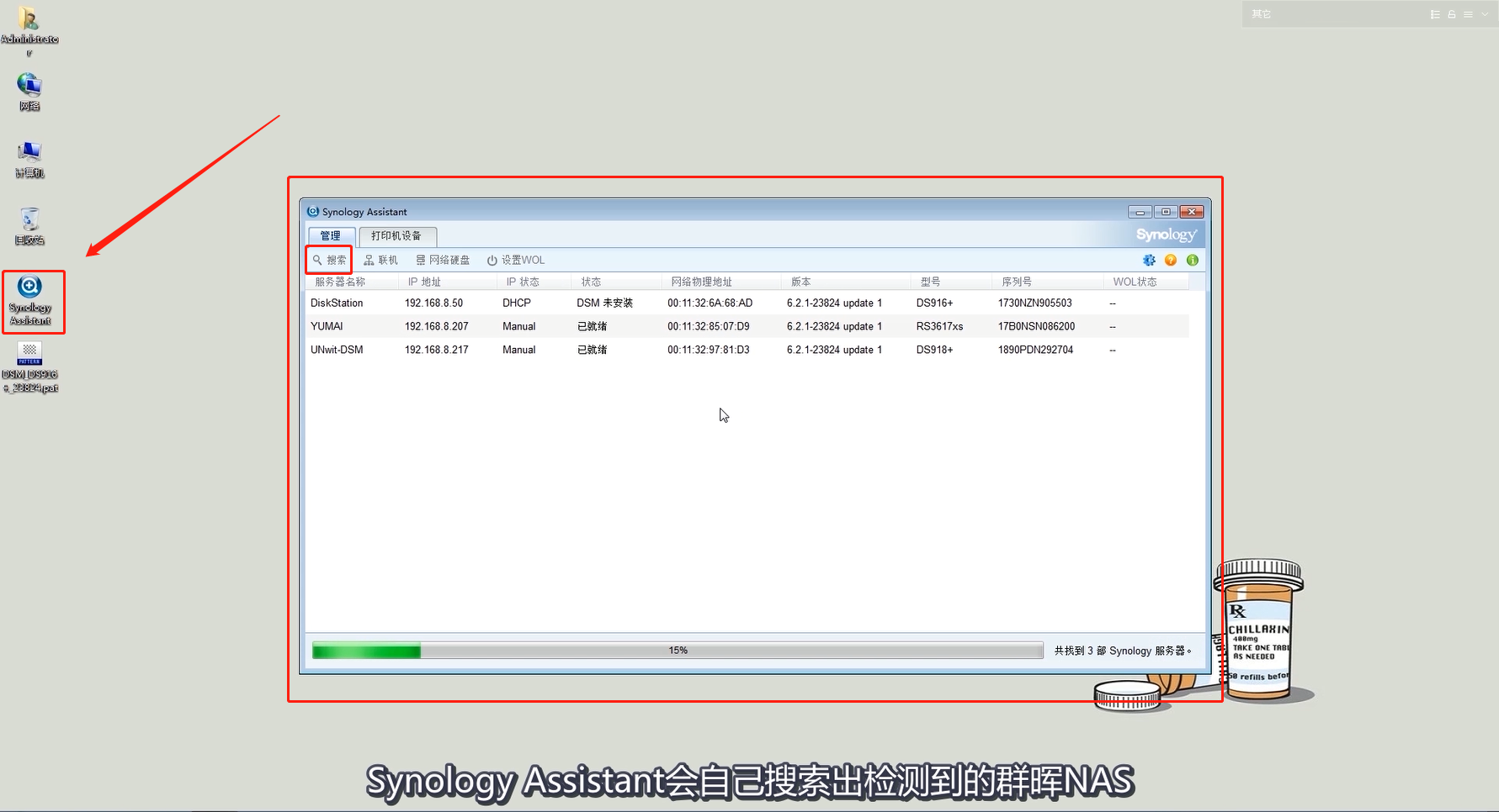 先按照平時(shí)安裝新軟件,安裝好群暉 Synology Assistant 之后,打開 Synology Assistant 軟件掃描同網(wǎng)絡(luò)內(nèi)的群暉 NAS網(wǎng)絡(luò)存儲設(shè)備。
