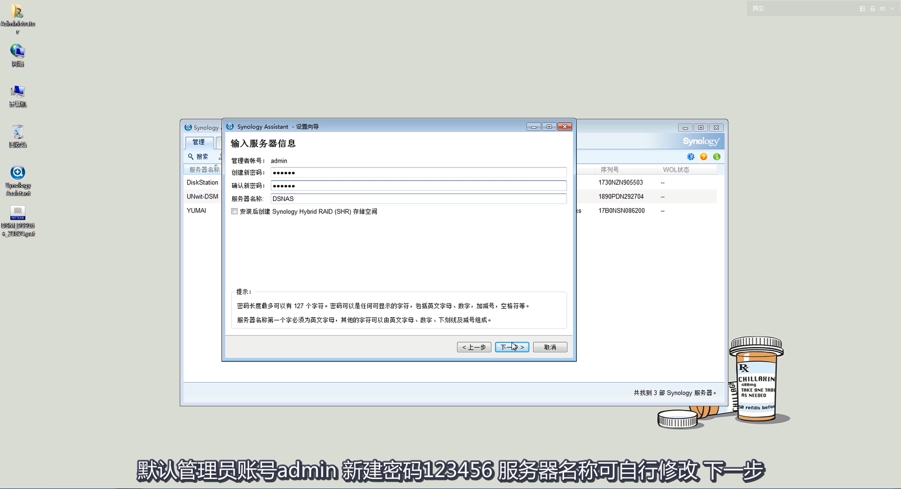 下一步,輸入管理員的密碼,可以根據(jù)自己需要修改服務(wù)器名稱,這里不改后面也可以在系統(tǒng)里面修改。先不要勾選安裝后創(chuàng)建 Synology Hybrid RAID (SHR)存儲空間,太耗費(fèi)時(shí)間,有些用戶需要用 RAID 5或者其他陣列。