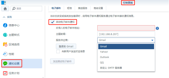 注意:服務(wù)供應(yīng)商有Gmail、Yahoo!、Outlook、QQ或者自定義SMTP服務(wù)器或者在信息中心注冊(cè)synology賬戶接收系統(tǒng)的告警信息。