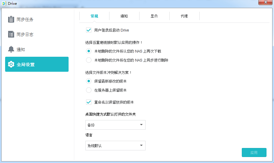 在全局設置中,您可配置當重新鏈接時,從計算機刪除的文件將從 NAS 被重取還是將在 NAS 上被刪除。